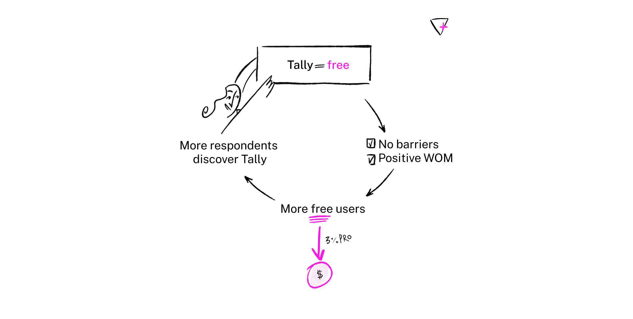 Besides word of mouth, our product itself has become our biggest acquisition channel. Tally is largely free, and free users have a "made with Tally" badge displayed on their forms. This results in more visibility for our product, new users and eventually paying subscribers. We describe how our growth flywheel works in this post.