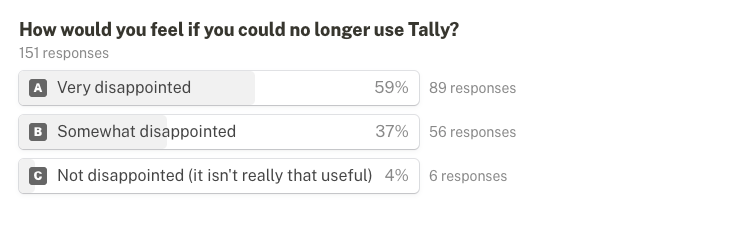 We decided to ask our users for feedback and launched a satisfaction survey. We were very happy to find out that 59% of our users said to be very disappointed if they could no longer use Tally. The survey gave us more insights into our ideal customer, acquisition channels, competitors, and opportunities to improve our product. Feel free to try it out for your own startup.