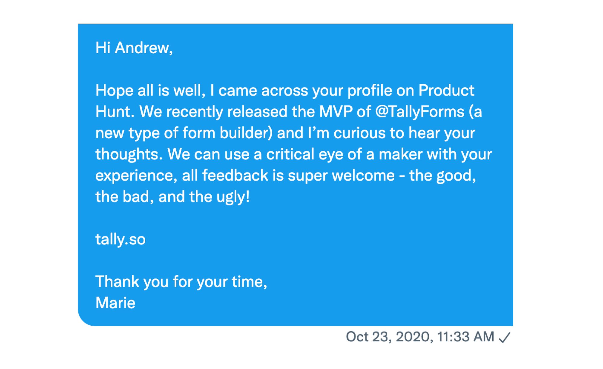 After processing their feedback we started with cold outreach to creators, Indie Hackers, and startup founders, who might be interested in our product. We scanned Product Hunt and Twitter and made lists of hundreds of prospects and started doing cold outreach, asking for their feedback. Often without success, but those who did take the time to reply became part of our community of early users and ambassadors.
