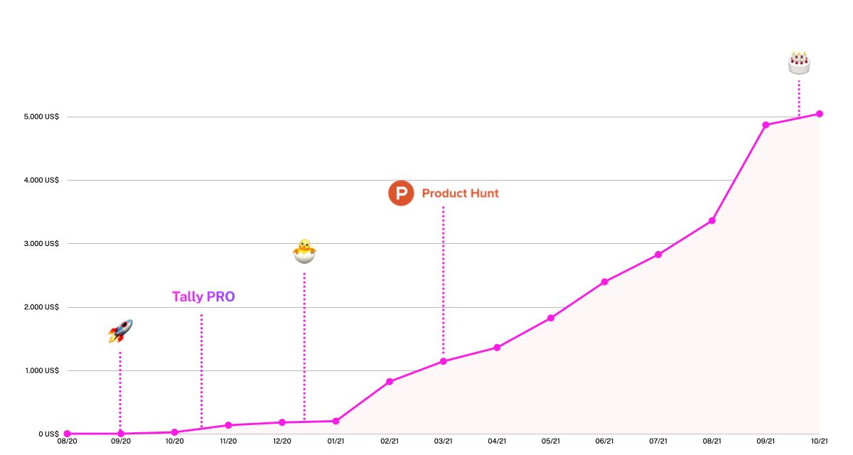 We started building in the summer of 2020 and showed our MVP to the world in September. Our official launch on Product Hunt in March 2021 was an instrumental step in gaining exposure and we have now crossed $5K MRR and 11.000 users. We are a small team of 2 based in Belgium, Europe and Tally is completely independent, self-funded and bootstrapped.